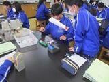 連休明けの火曜日ですが、しっかりと授業に取り組んでいます。2年生理科の授業では、回路にかかる電圧を測定していました。電圧計などの使い方が久しぶりでしたので、映像や班内で確認しながら、電源、電球を配線し、プラス・マイナスを留意し接続、数値の読み取りをしていました。