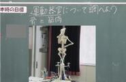 2年生の理科では、運動器官について学習していました。 「人間の骨は何本くらい?」、「今まで骨折した人はいる?」の問いや、人骨の標本をもとに、「腕を曲げると、ここの筋肉が盛り上がってくる?」など自分の腕を動かしながら、学んでいました。人の骨や筋肉は重要なものです。その原理等を学んで、人体の幅広い知識を習得してほしいです。